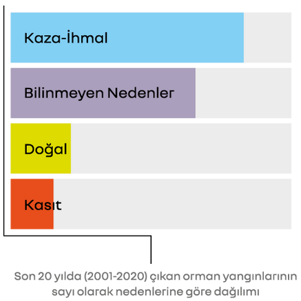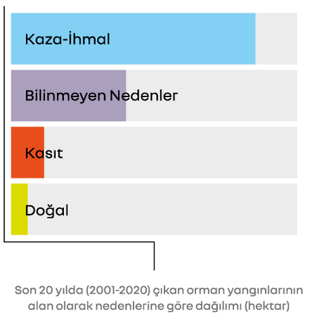 Son 20 yıla (2001-2020) bakıldığında Türkiye'de her yıl ortalama 2 bin 216 adet orman yangını çıkmakta ve yine ortalama 8 bin 319 hektar orman alanı yanmaktadır.